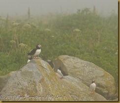 All three of the Alcids on the island were able to be viewed from the blinds and the sheer numbers of birds were mind-boggling. You had to concentrate on a particular bird so you wouldn't keep jumping from bird to bird, especially if you were photographing them. Because of the fog that kept coming and going it did make some of the photography harder . I was happy that I was able to capture birds in flight, and a puffin carrying fish back to the nest.